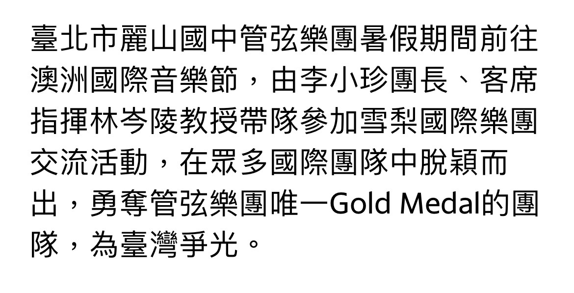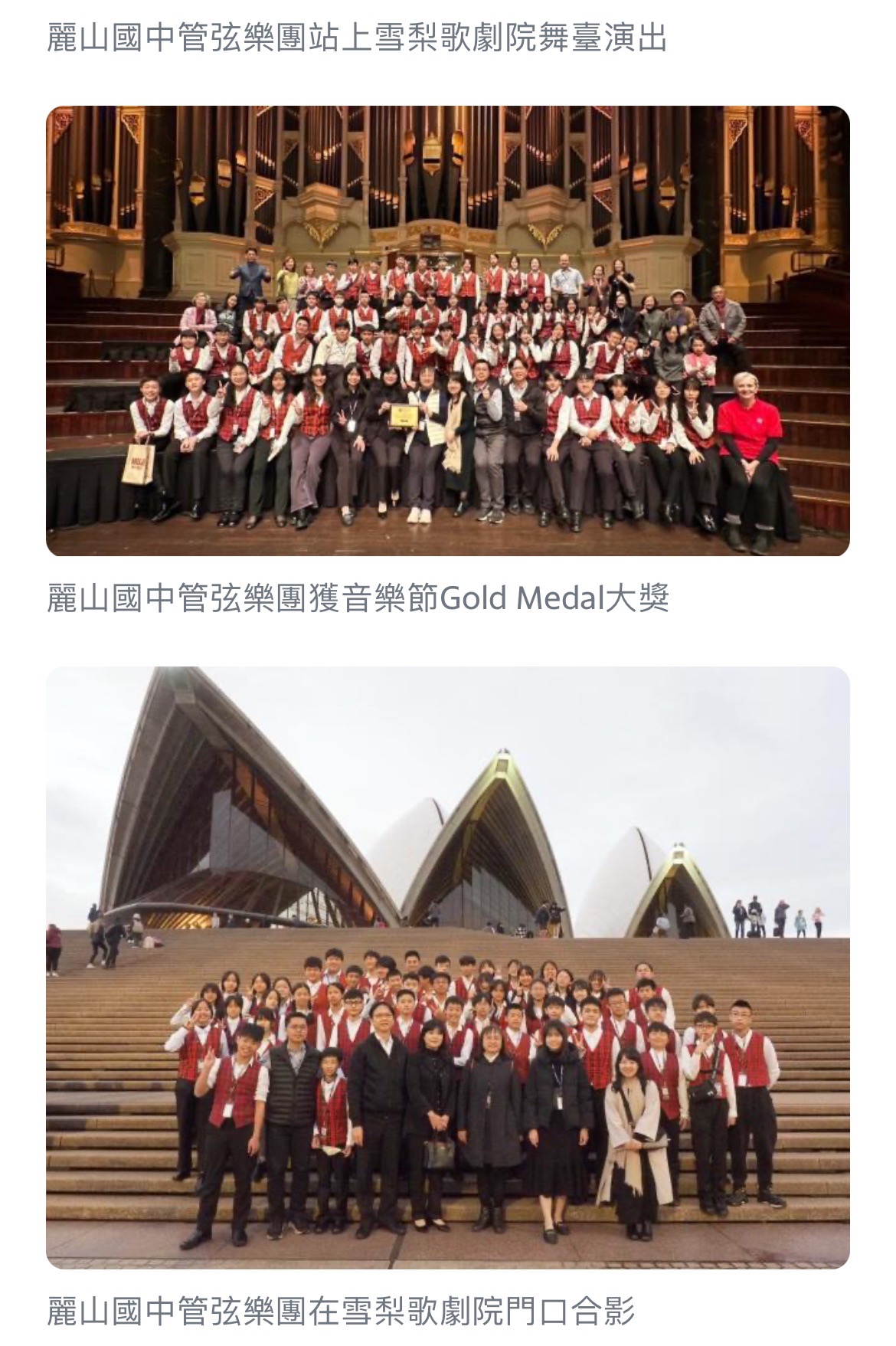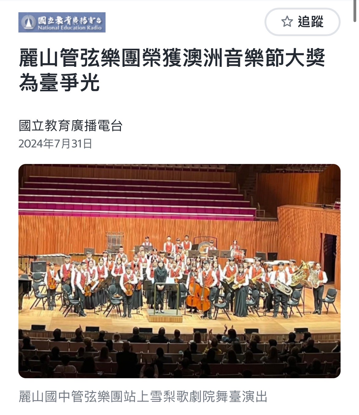 恭喜臺北市麗山國中管弦樂團,在澳洲國際音樂節中勇奪管弦樂團唯一金牌,堪稱台灣之光!