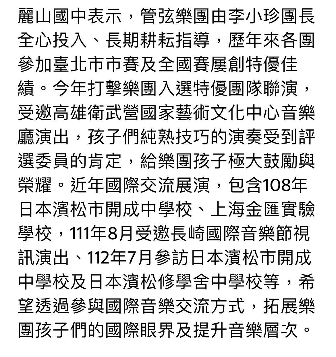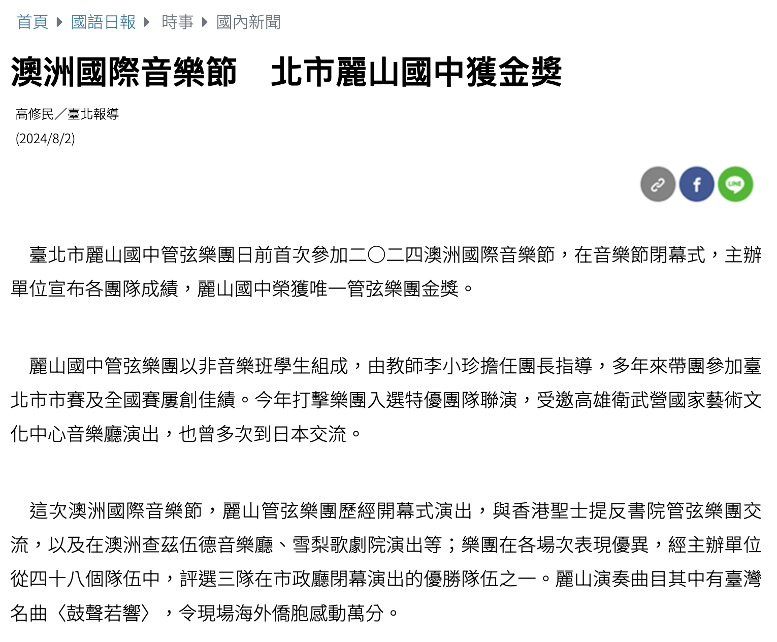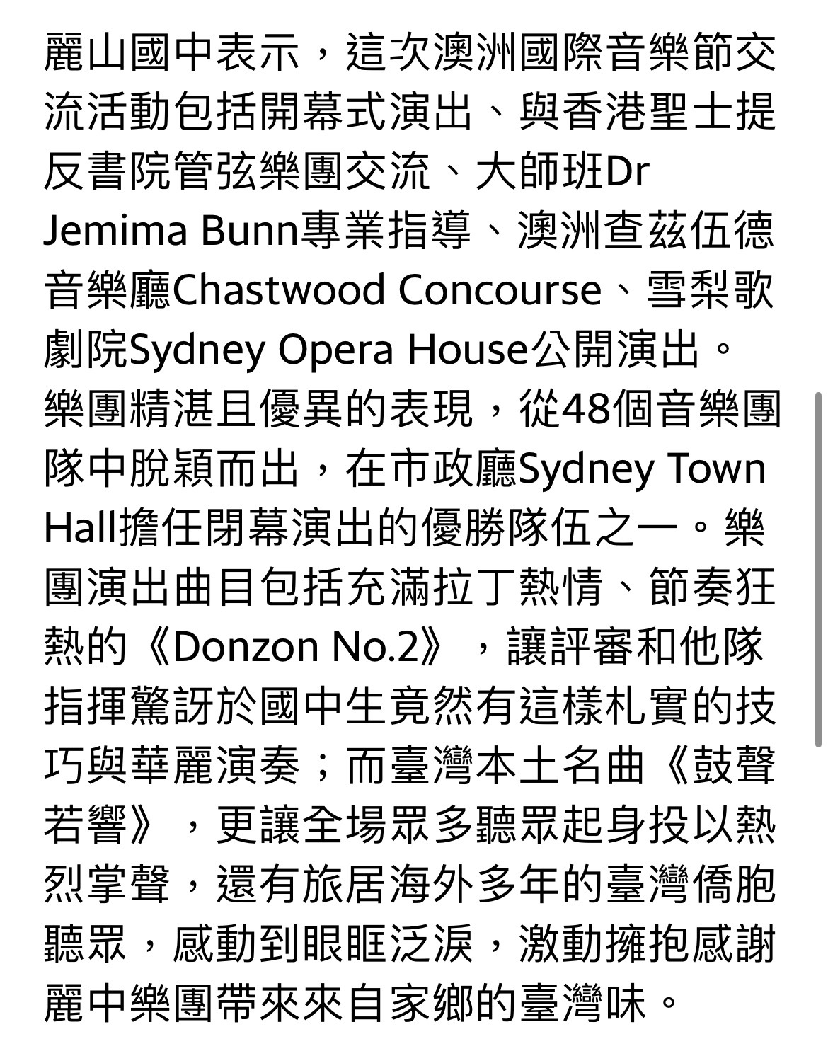 恭喜臺北市麗山國中管弦樂團,在澳洲國際音樂節中勇奪管弦樂團唯一金牌,堪稱台灣之光!