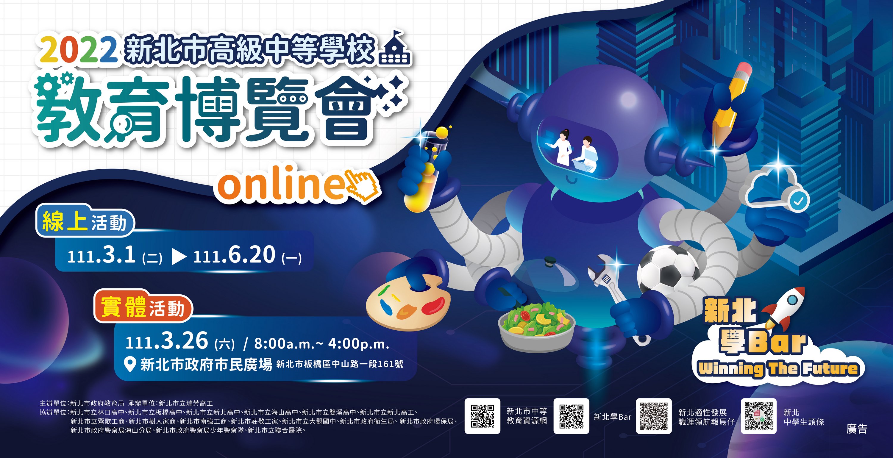 新北市110學年度公私立高級中等學校教育博覽會 新北學 Bar-- Winning the Future 日期:111年3月26日 星期六 時間:上午8時至下午4時 地點:新北市政府市民廣場及市府1樓大廳 展覽內容:各校辦學特色及教學成果展示與發表